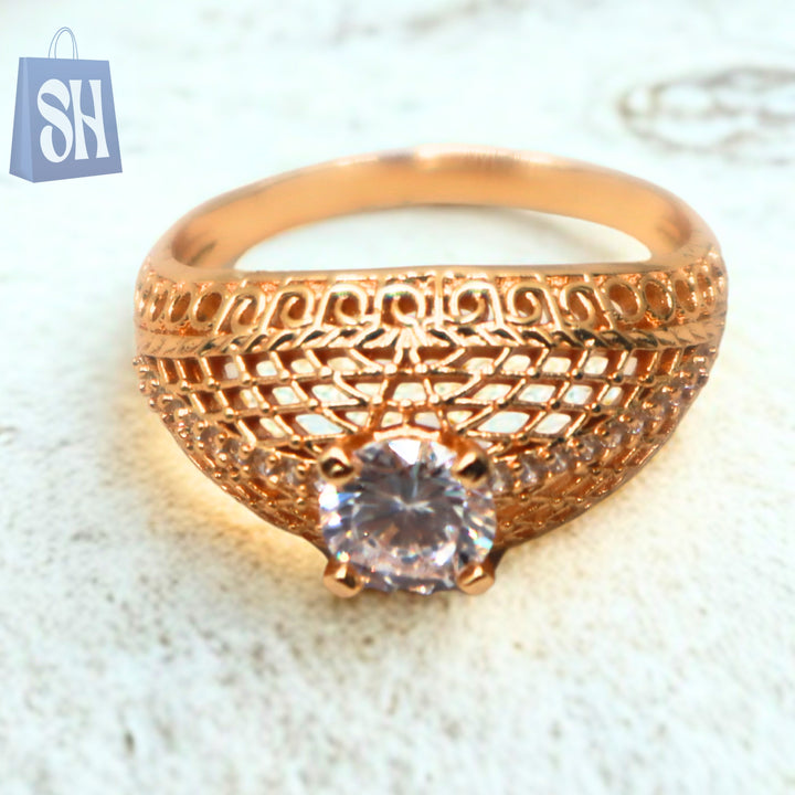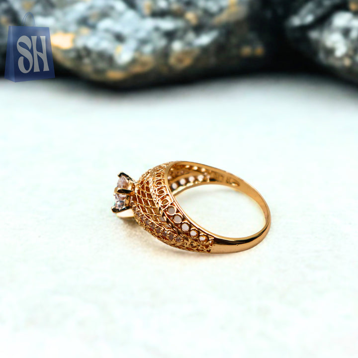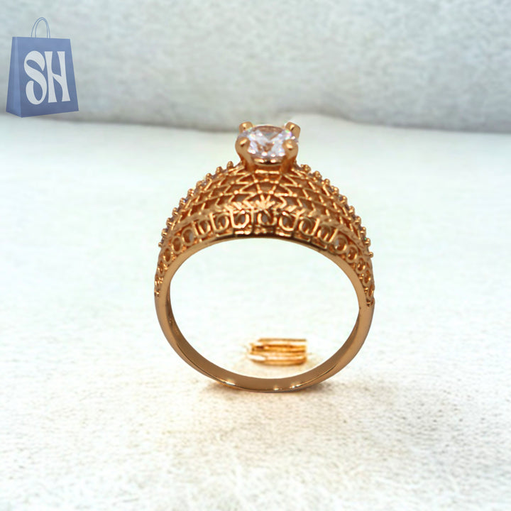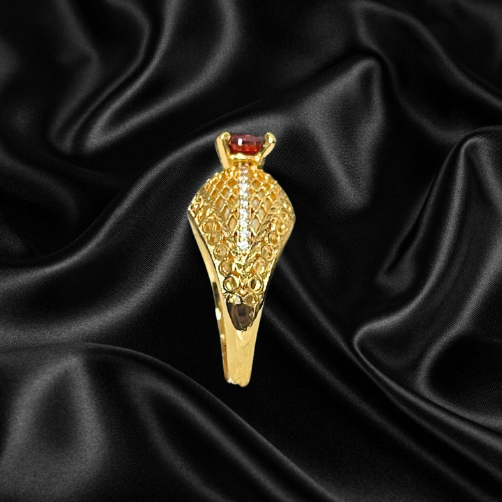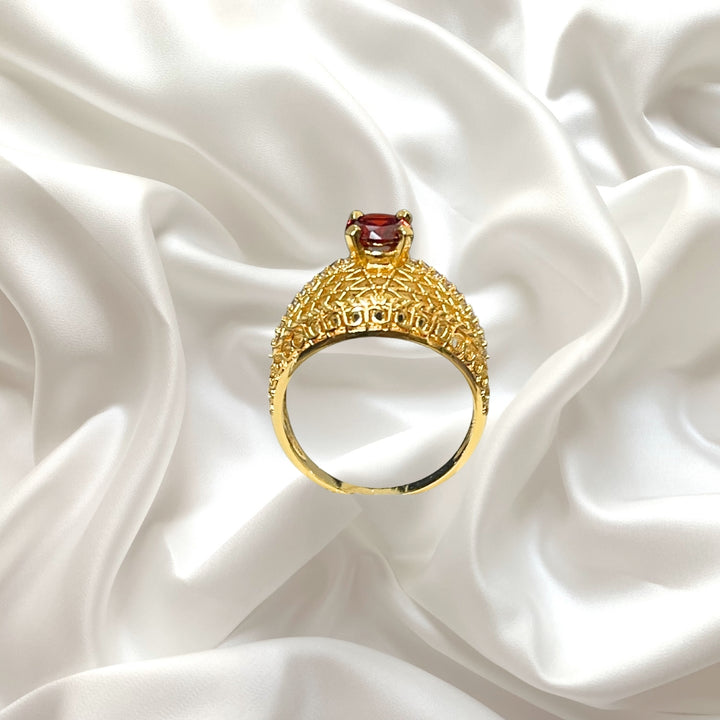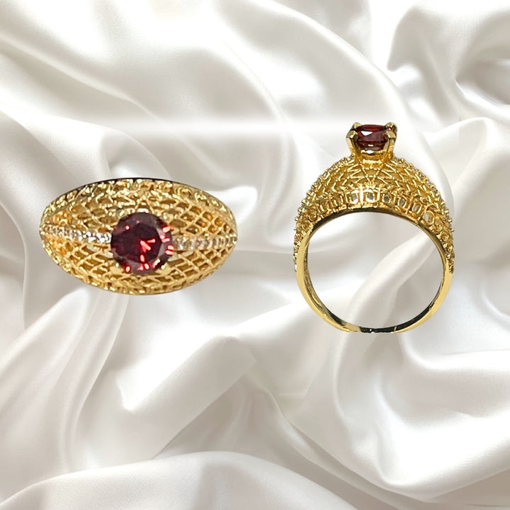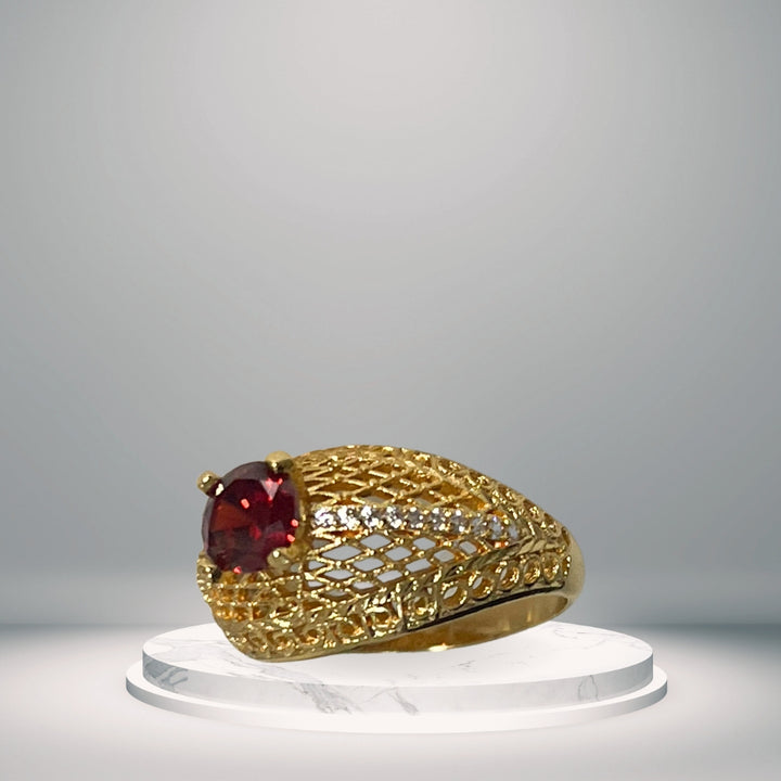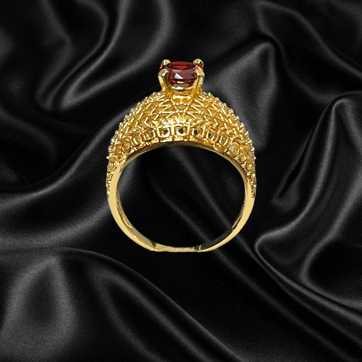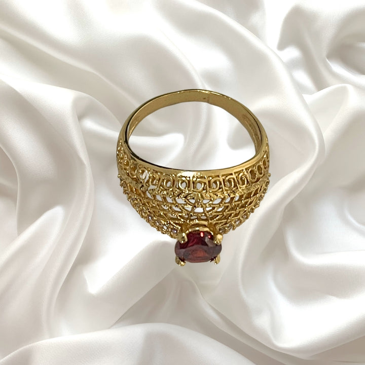 يتميز هذا الخاتم المطلي بالذهب بتصميم فاخر ومعقد يتوّج بحجر كريم أحمر مذهل.