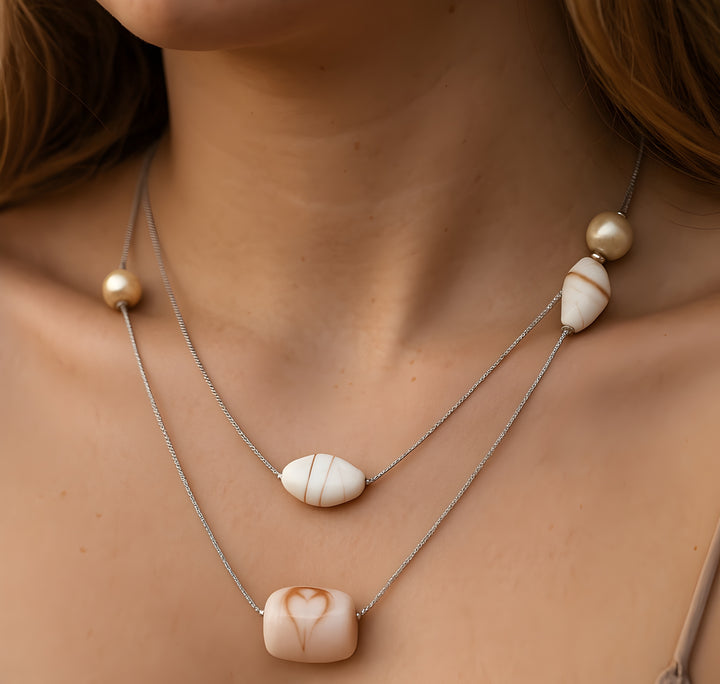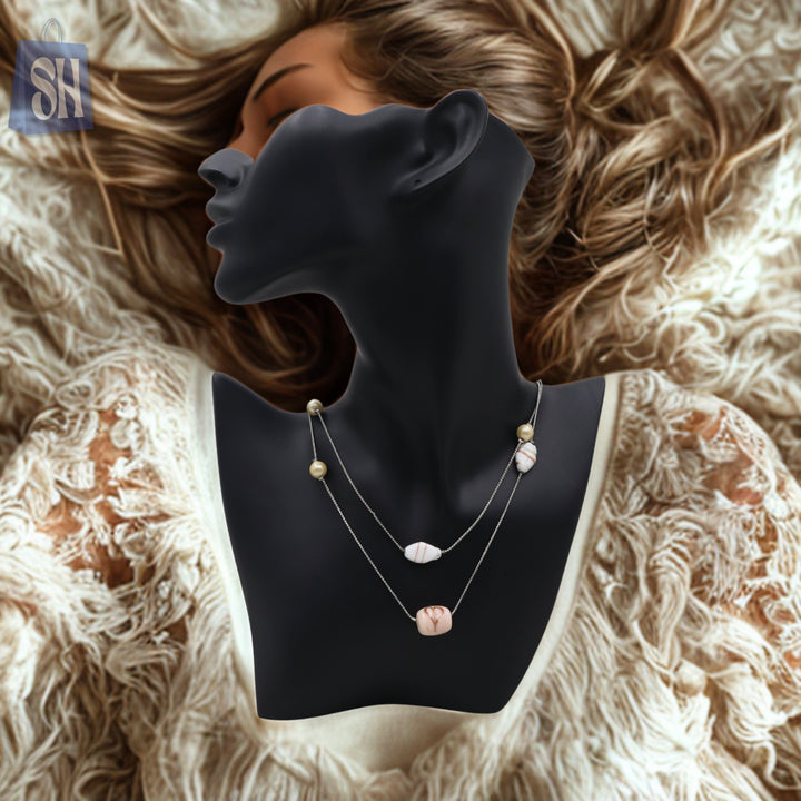عقد "بلش" ذو السلسلتين من الأحجار الكريمة، رقيق وأنيق، يتميز بسلسلتين فضيتين رقيقتين مزينتين بأحجار وردية ناعمة بلون وردي خدود ولمسات من اللؤلؤ المصقول. ينساب هذا التصميم البسيط والأنيق برشاقة على طول خط العنق، يضفي لمسة لونية رقيقة وسحرًا راقيًا. مثالي للارتداء فوق طبقات أو منفردًا، فهو مثالي للأناقة اليومية والمناسبات الخاصة.