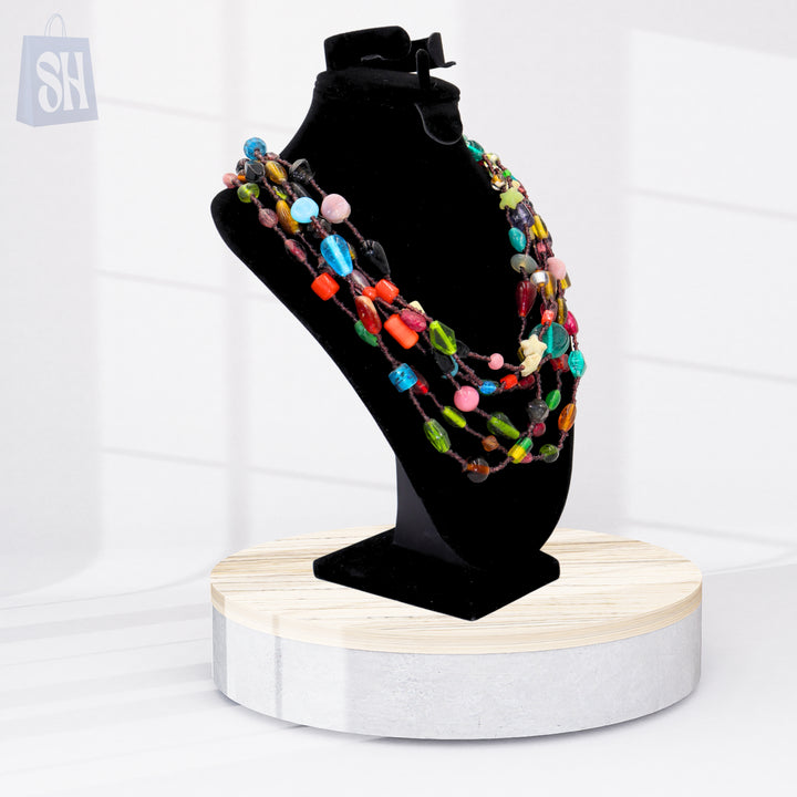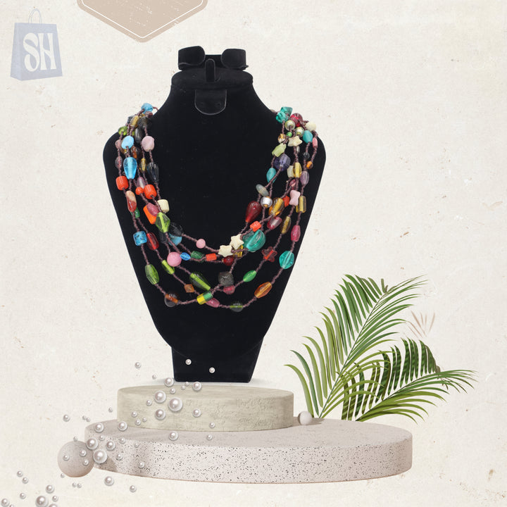 أبهري الجميع بهذه القلادة الرائعة متعددة الألوان والمرصعة بالخرز، المصممة خصيصًا لعاشقات التميز. تتميز هذه القطعة متعددة الطبقات بمزيجها الانتقائي من الخرز النابض بالحياة، مما يضفي حيوية وشخصية مميزة على أي إطلالة.