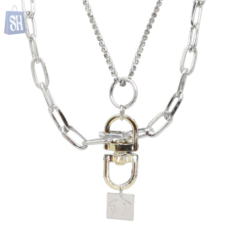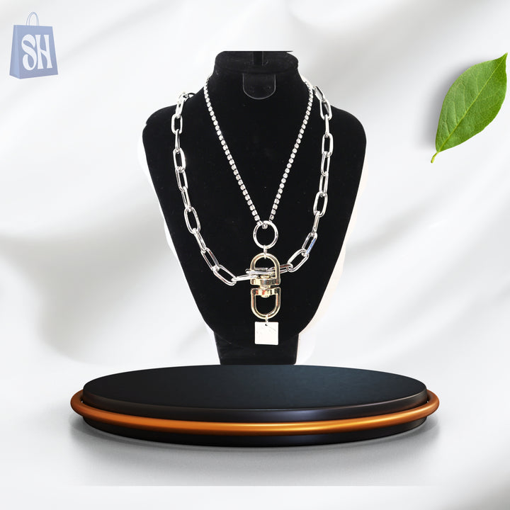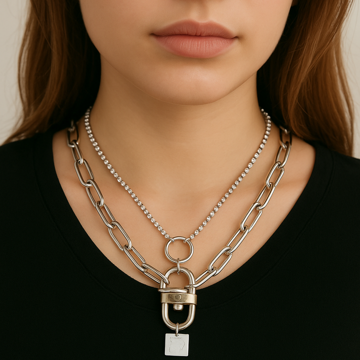 تألقي بإطلالة جريئة مع قلادة القفل ثنائية الطبقات - مزيج فريد من السلاسل الجريئة وتفاصيل القفل اللافتة. هذه القطعة مثالية لمن يجرؤن على التميز والتعبير عن تفردهن.