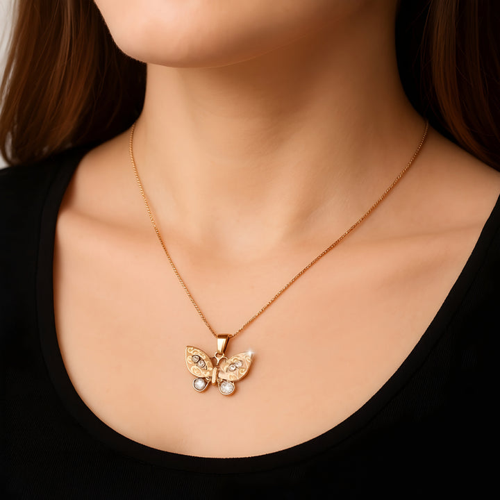استمتعي بجمال التحوّل مع قلادة "فراشة غريس" من شيمر هافن . تتميز هذه القلادة بتصميم فراشة متقن الصنع، مزينة بأحجار لامعة، وتجسّد الأناقة والخفة في كل تفاصيلها. مثالية لسحر يومي أو هدية مميزة، إنها رمز خالد للأمل والتجديد - مصممة لتمنحكِ تألقًا لا يُضاهى.