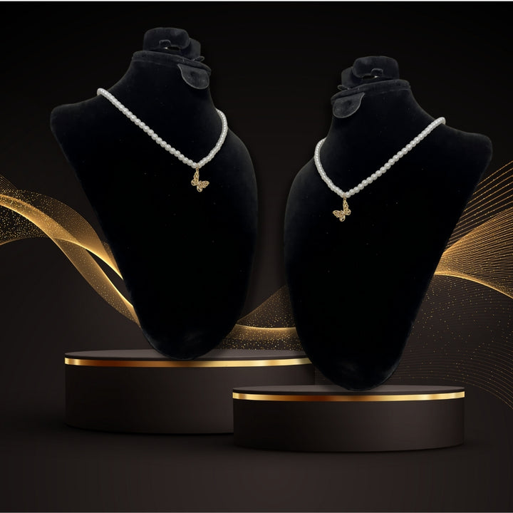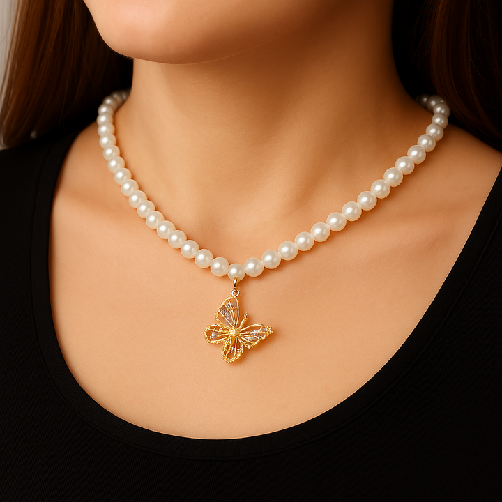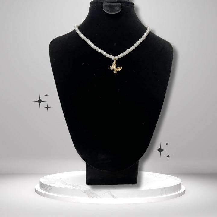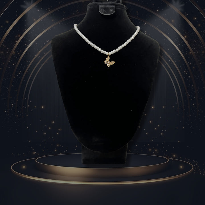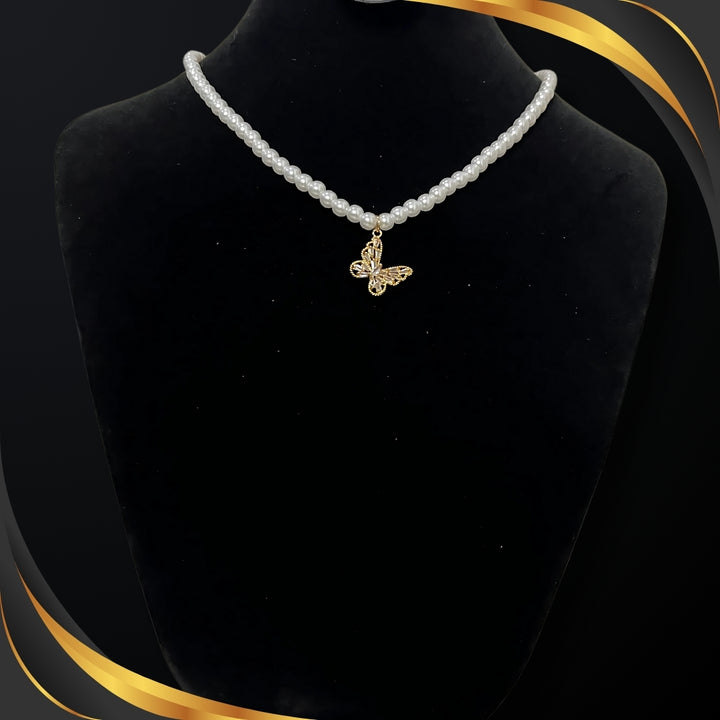 عقد لؤلؤه الفراشة الرائع هذا يتميز بقلادة فراشة رقيقة مزينة بلآلئ لامعة. بتصميمه الأنيق وجماله الكلاسيكي، يُعد هذا العقد الإكسسوار المثالي لأي مناسبة، ويضيف لمسة من الرقي لأي إطلالة. مصنوع يدويًا بعناية فائقة، قطعة خالدة تستحق التقدير.