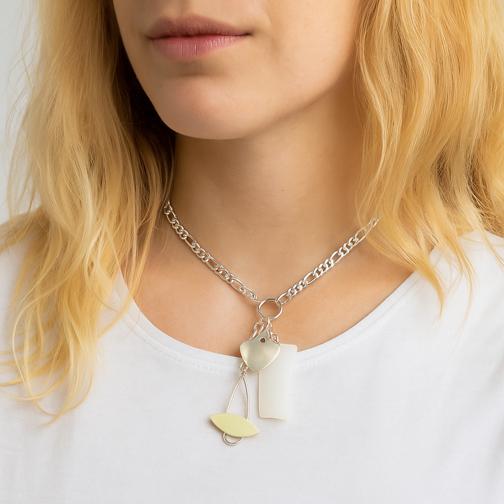 أضف لمسة من الرقي والجمال إلى إطلالتك مع قلادة "سيلستيال هارموني تشارم" . تتميز هذه السلسلة الفضية بمجموعة ساحرة من المعلقات الانتقائية، بما في ذلك قلب مزخرف، وشظية قزحية منحنية، وقلادة مركبة فضائية مصغرة - ترمز إلى الحب والضوء والفضول الكوني. مثالية لعشاق الإكسسوارات الفريدة ذات القصة، تضفي هذه القلادة لمسة مرحة وأنيقة على إطلالتك اليومية. مثالية لعشاق الفضاء، والحالمين، وصانعي الإلهام على حد سواء.