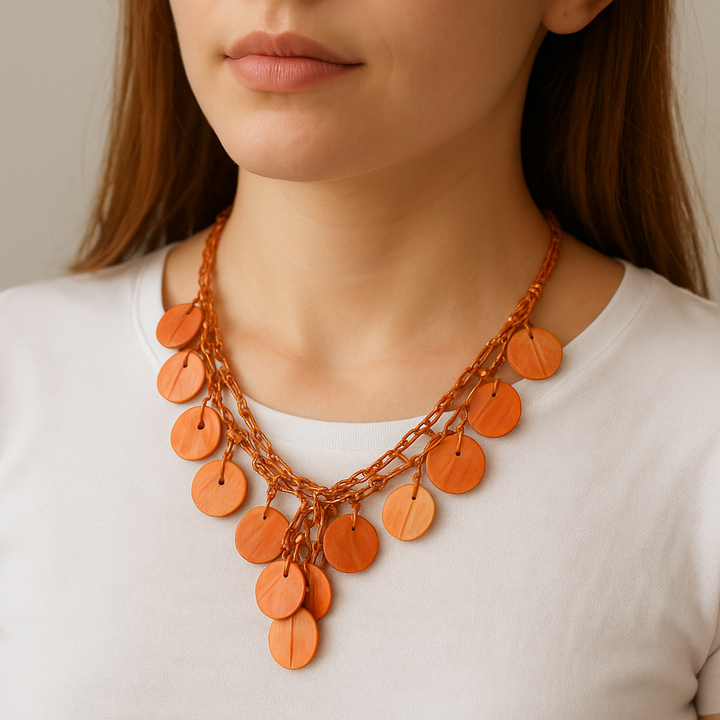 أضفي لمسة استوائية على إطلالتك مع قلادة قرصية من صدفة المرجان. تتميز هذه القطعة بخيوط متعددة من الخيوط الرقيقة المزينة بأقراص صدفية لامعة بلون المرجان، مما يضفي عليها أناقة طبيعية وحركة مميزة. مثالية للنزهات الشاطئية، والمناسبات الصيفية، أو لإضفاء لمسة من البهجة على إطلالة محايدة بلمسة من السحر النابض بالحياة. خفيفة الوزن وخفيفة الوزن، تضفي لمسة ساحلية أنيقة على مجموعة مجوهراتك.