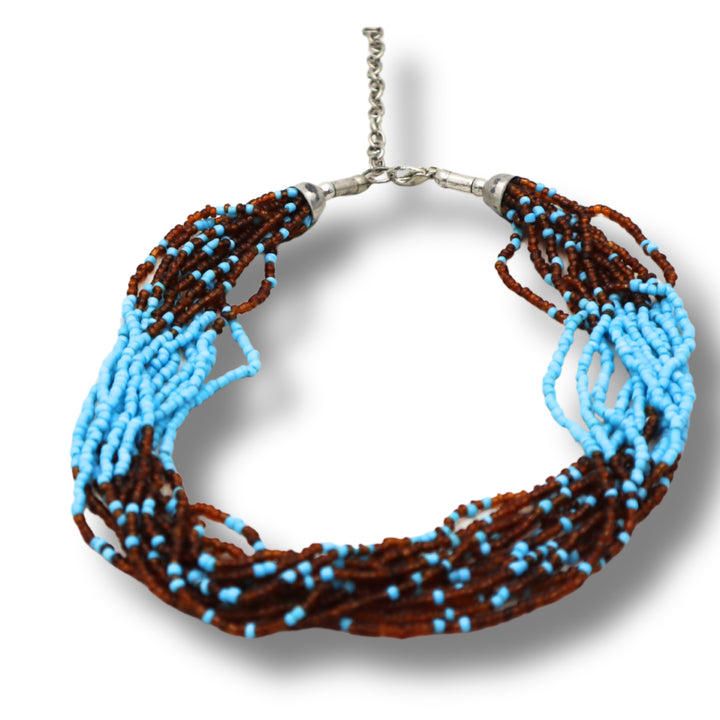 تألقي بأناقة طبيعية مع قلادة Earth & Sky Beaded Statement - قطعة رائعة متعددة الطبقات تجمع بين خرزات البني الغامق والفيروز الناعم في تصميم متناغم. مستوحاة من ألوان الأرض الهادئة وألوان السماء الهادئة، تضفي هذه القلادة سحرًا ريفيًا وراقيًا على خزانة ملابسك. مثالية لإضافة لمسة بوهيمية أو لمسة فريدة إلى إطلالاتك اليومية.