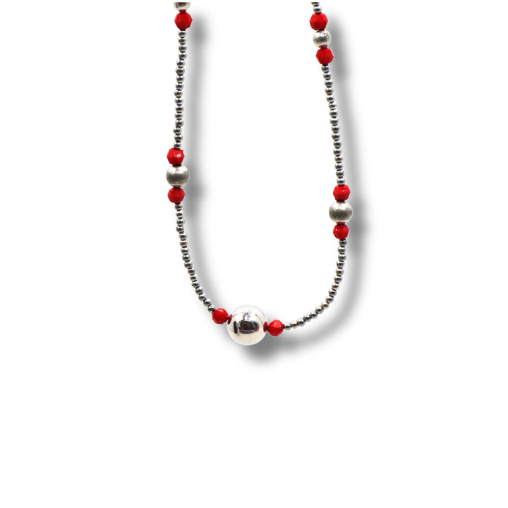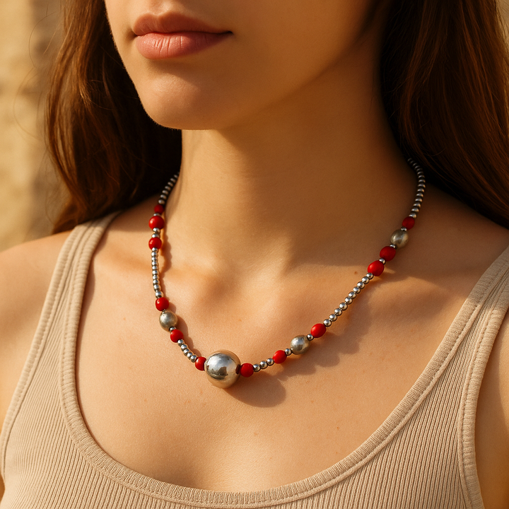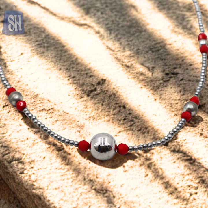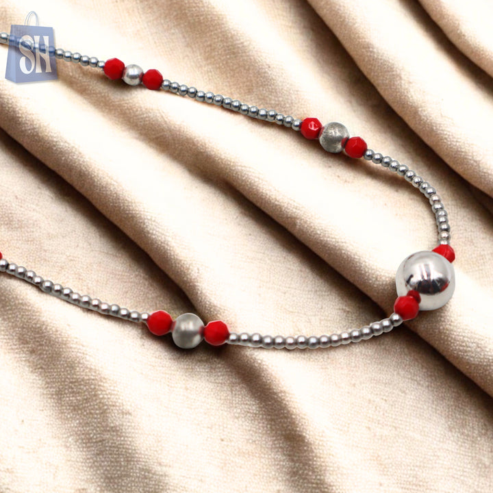 أضفي لمسة من الرقي إلى إطلالتك مع هذه القلادة الأنيقة المصنوعة من الخرز الفضي والأحمر. تتميز هذه القطعة الخالدة بمزيج رائع من الخرز الفضي الأنيق ولمسات حمراء زاهية، وهي مثالية لأي مناسبة. تصميمها خفيف الوزن يضمن لك راحة طوال اليوم، بينما يتناسب أسلوبها المتنوع مع الإطلالات الرسمية وغير الرسمية. عززي مجموعة إكسسواراتك بهذا المزيج الرائع من الأناقة والسحر!