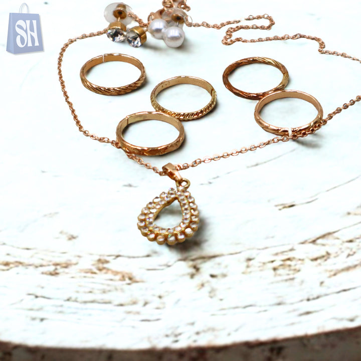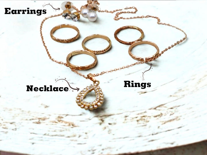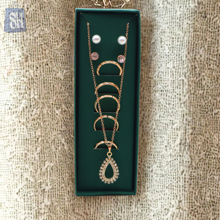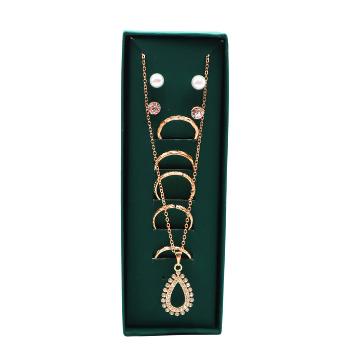 طقم المجوهرات الذهبي الرائع هذا، المُختار بعناية، هو الهدية المثالية لأي مناسبة. يتضمن الطقم قلادة أنيقة على شكل دمعة مرصعة بأحجار لامعة، وستة خواتم بتصاميم دقيقة، وزوجين من الأقراط الكلاسيكية - أحدهما مرصع بلآلئ صناعية لامعة والآخر مرصع بكريستالات وردية ناعمة. تُقدم هذه المجموعة متعددة الاستخدامات في علبة فاخرة باللون الأخضر الداكن، وتمزج بين الرقي والأناقة اليومية، مما يجعلها مثالية للمناسبات الرسمية وغير الرسمية.