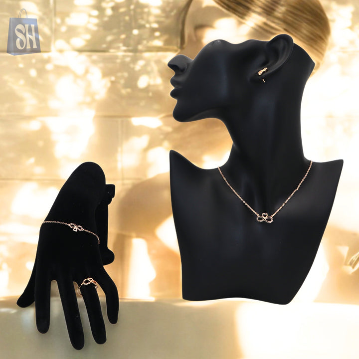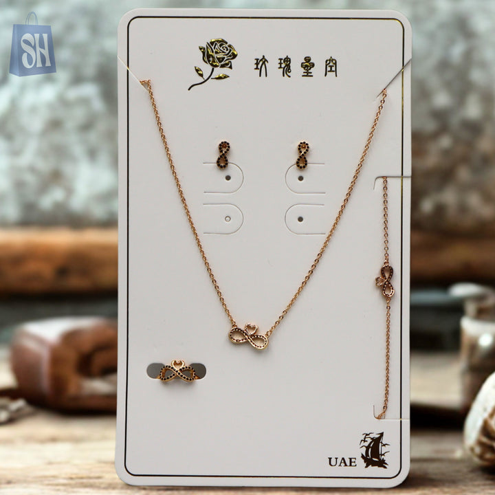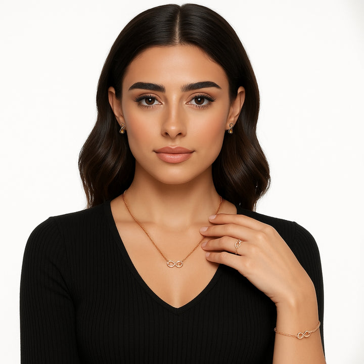 احتفلي بالحب والأناقة اللامتناهية مع طقم المجوهرات الرائع هذا المكون من أربع قطع والمُصمم برمز اللانهاية . يتكون الطقم من قلادة وسوار وخاتم وأقراط، جميعها مزينة بتصاميم رقيقة مستوحاة من رمز اللانهاية، مما يجعله مثاليًا لإضافة لمسة من التألق إلى إطلالتك اليومية.