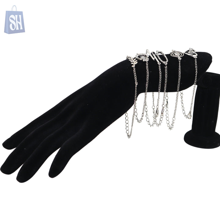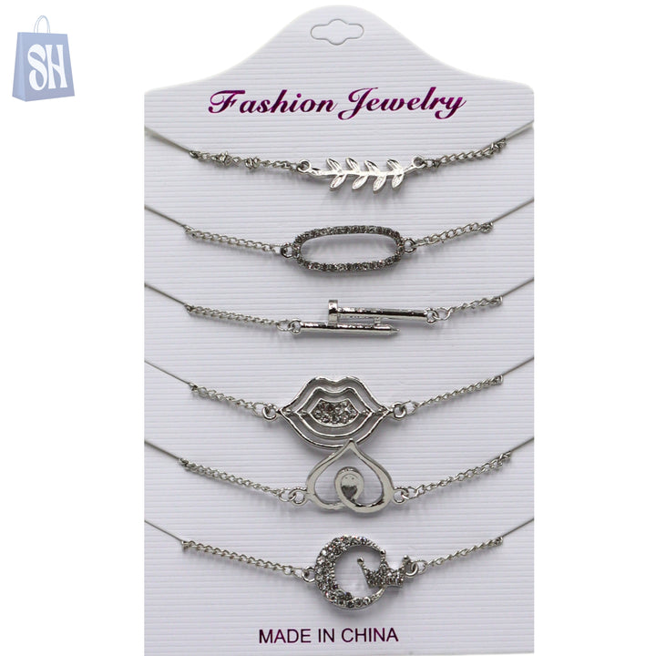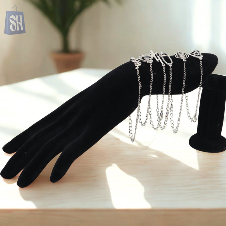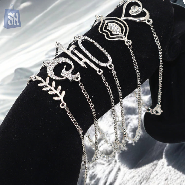 أضف لمسة من التألق والشخصية المميزة إلى إطلالتك مع مجموعة الأساور الفضية الأنيقة هذه، والتي تضم خمسة تصاميم خلابة. كل سوار مصنوع بدقة بلمسات نهائية فضية اللون ومزين بأحجار الراين المتلألئة، ليمنحك مزيجًا مثاليًا من الأناقة والرقي.