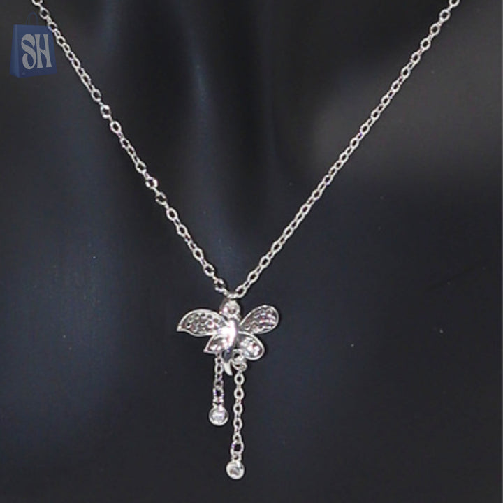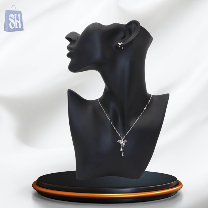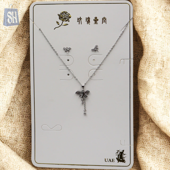 أضفي لمسة من السحر والأناقة إلى إطلالتك مع طقم مجوهرات الفراشة الفضي الرائع هذا، والذي يتكون من عقد رقيق وأقراط متناسقة. تصميم الفراشة المتقن، المزين بأحجار لامعة، يجعله خيارًا مثاليًا للارتداء اليومي والمناسبات الخاصة.