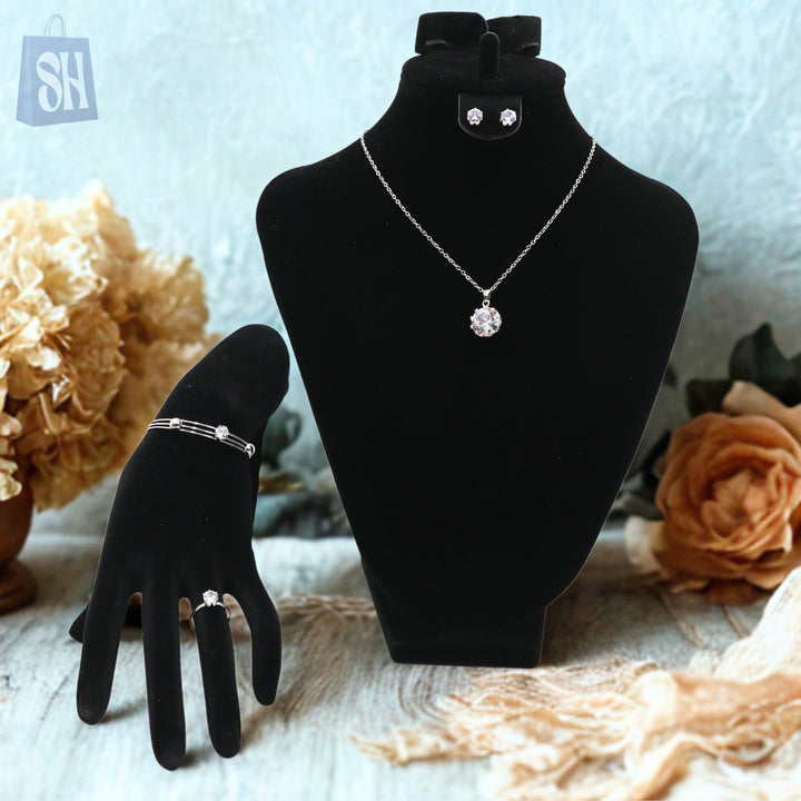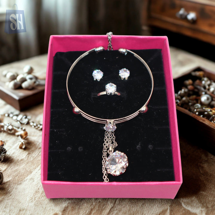 تألقي بأناقة خالدة مع طقم المجوهرات الفضي الكريستالي هذا، المكون من أربع قطع ، بتصميم سوليتير بقطع لامع. يتضمن هذا الطقم المتناسق قلادةً متدليةً مبهرة، وأقراطًا مرصعة بالكريستال متناسقة، وسوارًا أنيقًا، وخاتمًا مميزًا - جميعها مزينة بكريستالات متلألئة تلتقط الضوء ببراعة. مثالي لحفلات الزفاف، والمناسبات الرسمية، أو لإضافة لمسة من الأناقة إلى أي إطلالة.