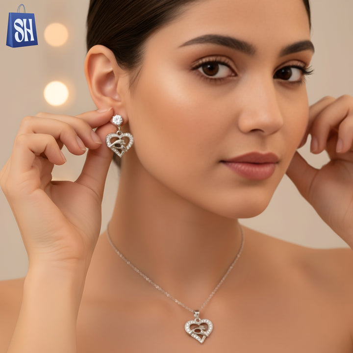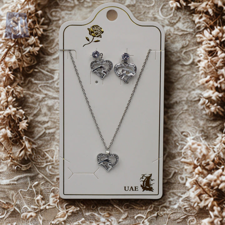 أضفي لمسة من الأناقة والفخر الثقافي إلى إطلالتك مع طقم المجوهرات الرائع هذا. يتميز بتصميم رقيق على شكل قلب، ويتضمن عقدًا وأقراطًا متناسقة، كلاهما مرصّع بأحجار براقة ورمز الصقر الإماراتي الأيقوني....