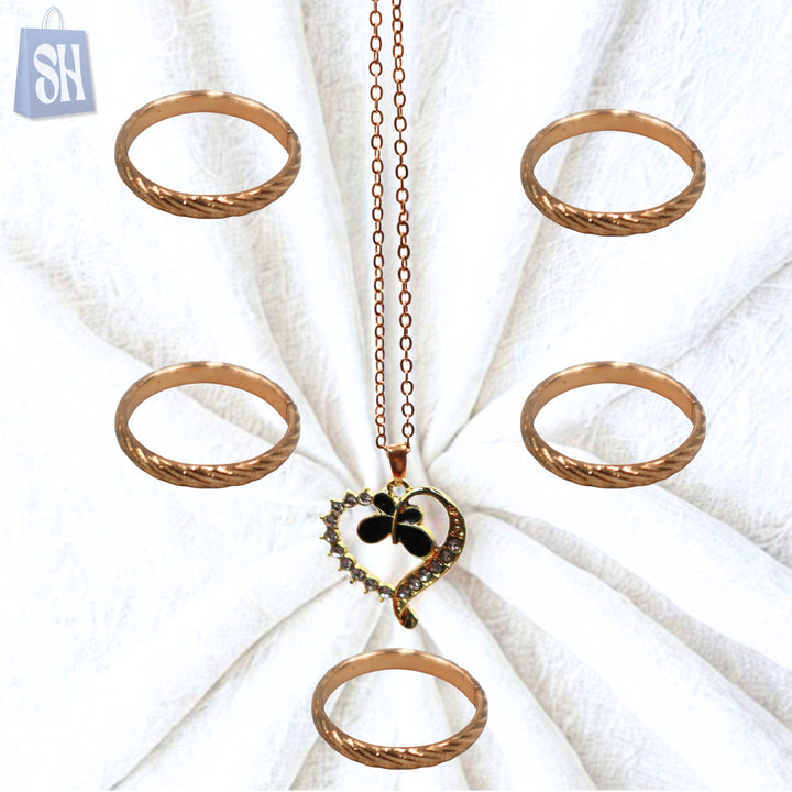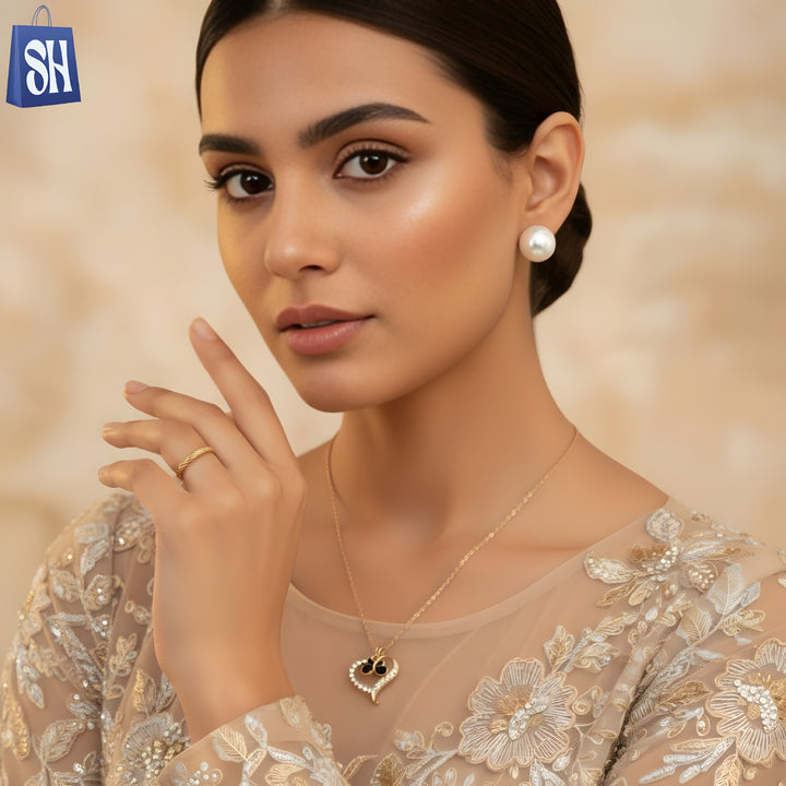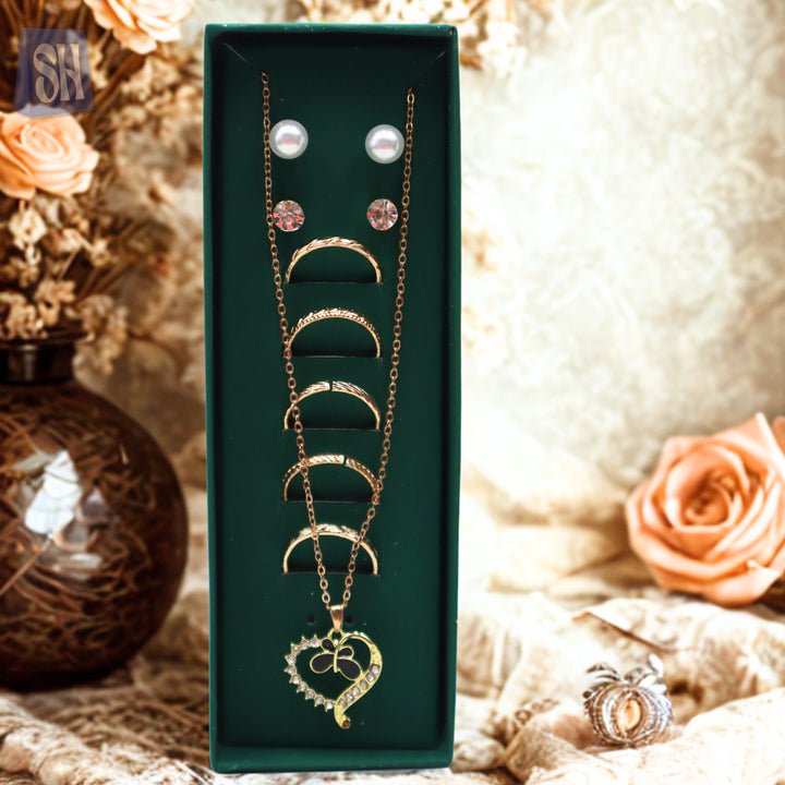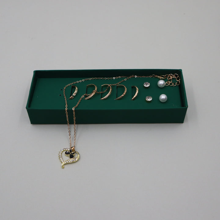 عززي أناقتكِ مع طقم المجوهرات الرائع هذا، المكون من 9 قطع، والمُقدم في علبة فاخرة باللون الأخضر الداكن. يتضمن الطقم عقدًا ذهبيًا بقلادة على شكل قلب مرصعة بأحجار الراين البراقة ونقشة زهرية متقنة. يتناسق مع العقد: