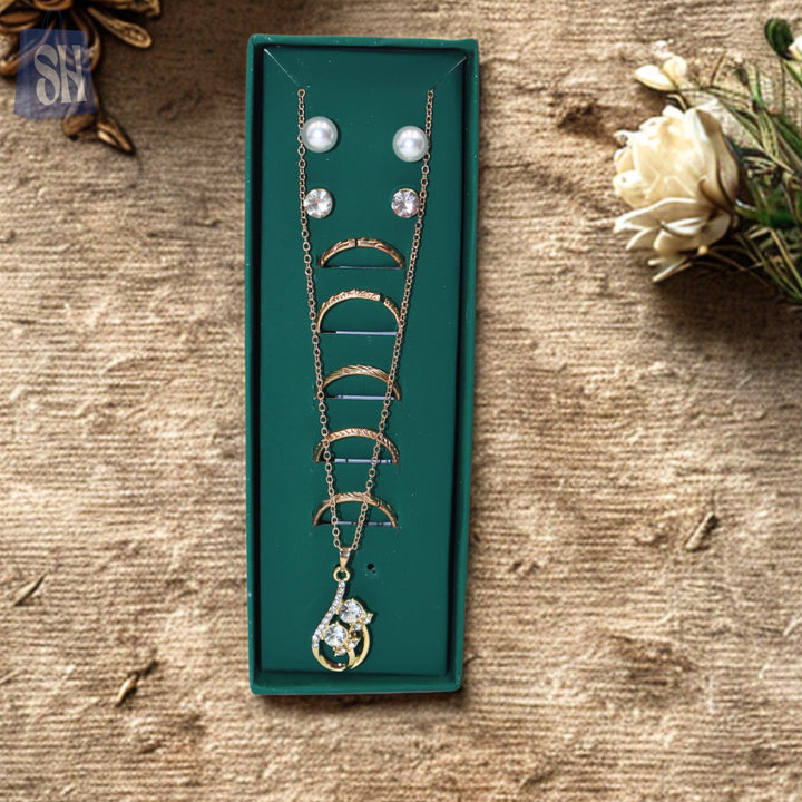 أضف لمسةً من الجمال الخالد إلى مجموعتك مع طقم المجوهرات الرائع هذا، المكون من 9 قطع، والمُعرض بأناقة في علبة عرض خضراء داكنة. يتميز الطقم بما يلي: