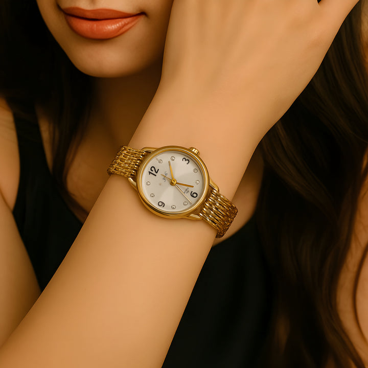 قم بترقية أسلوبك اليومي مع هذه الساعة النسائية الأنيقة، المصنوعة بلمسة نهائية ذهبية كلاسيكية وتفاصيل دقيقة.