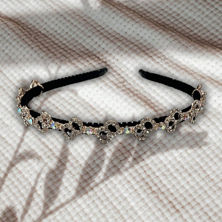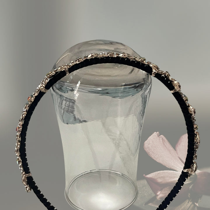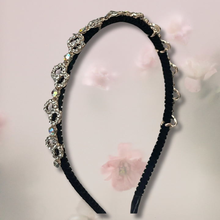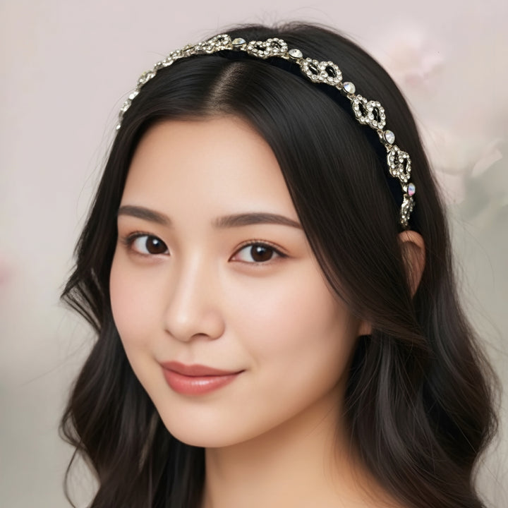 أضف لمسة من التألق إلى أسلوبك مع عصابة الرأس المذهلة هذه المزينة بالكريستالات اللامعة والحلقات المستوحاة من الأزهار.