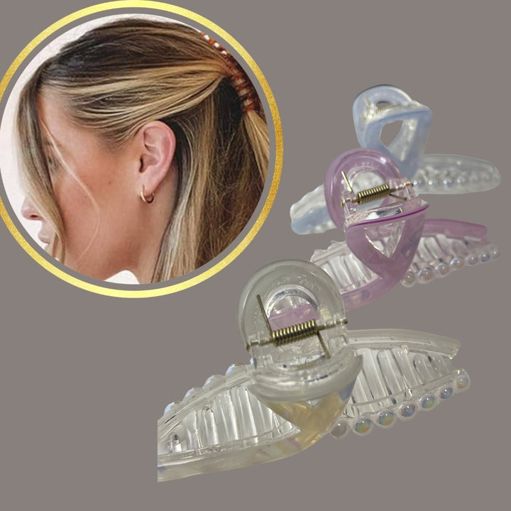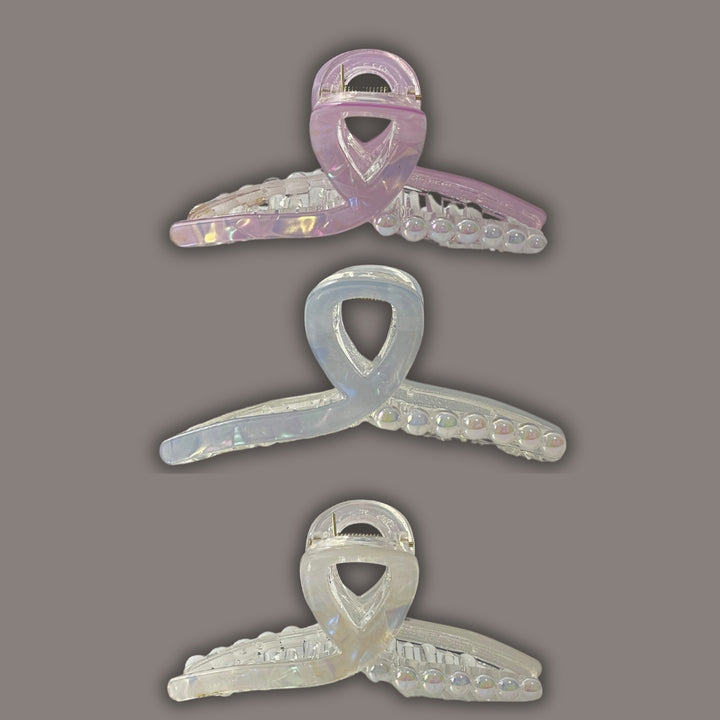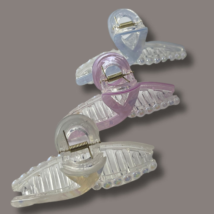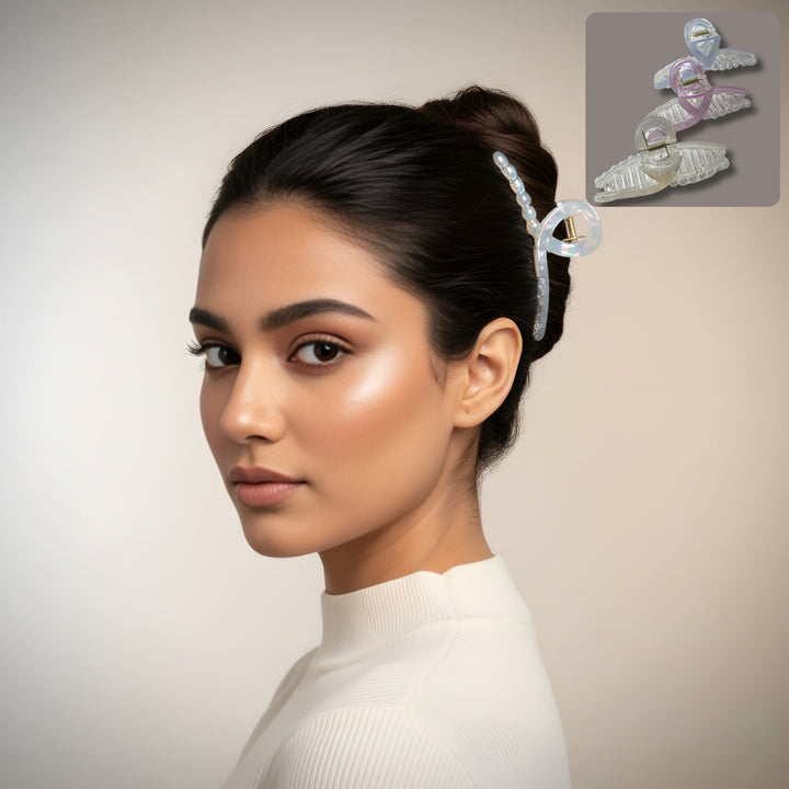 أضيفي لمسة ناعمة وساحرة إلى تسريحة شعركِ مع هذه المجموعة الثلاثية من مخالب الشعر الباستيل الشفافة. مزينة بتفاصيل لؤلؤية رقيقة، مثالية للأناقة اليومية أو لإطلالة أنيقة.