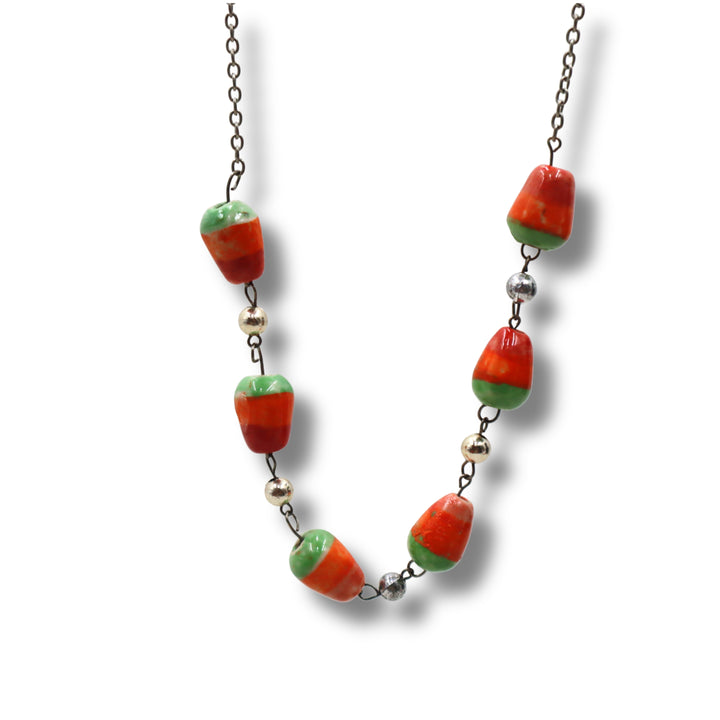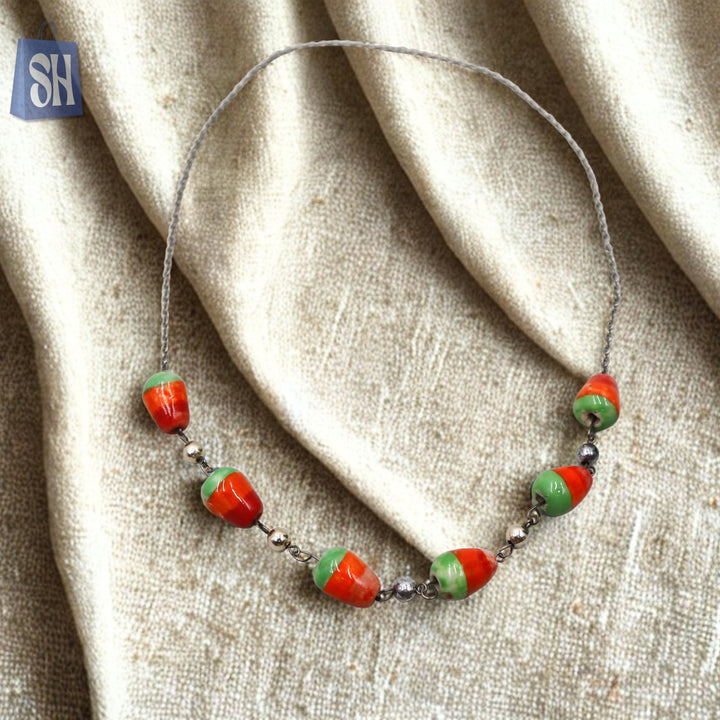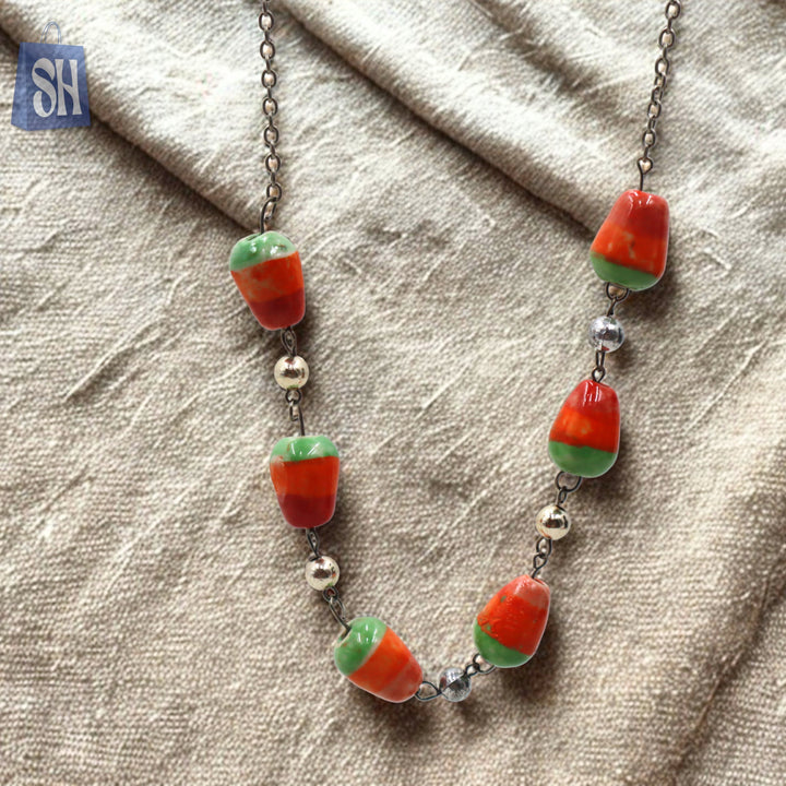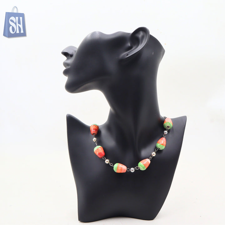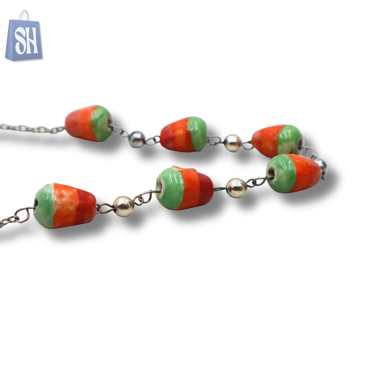 قلادة من الخرز مطلية يدويًا مع لمسات خضراء وحمراء.