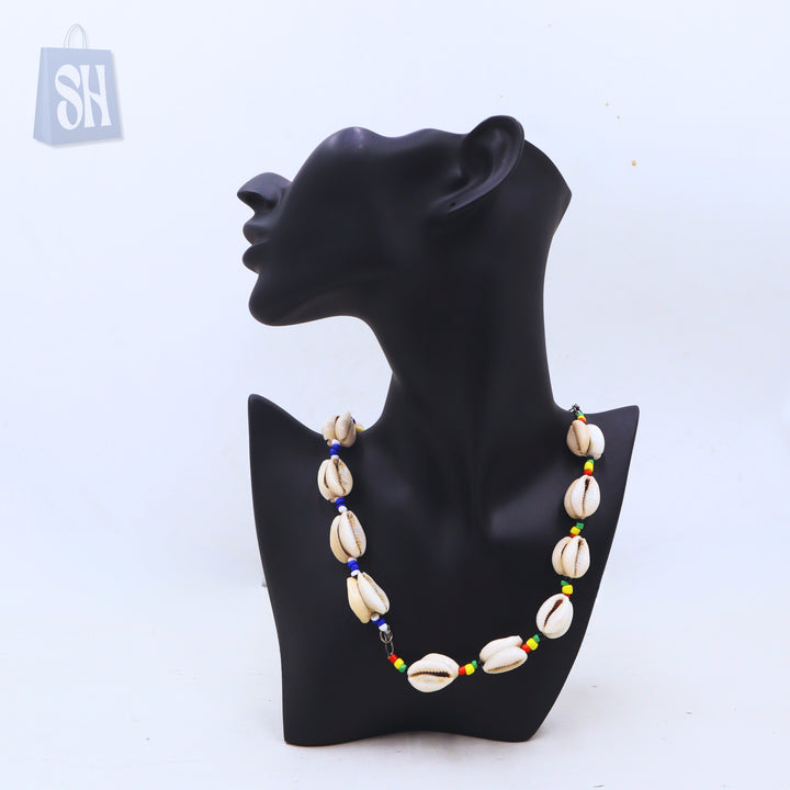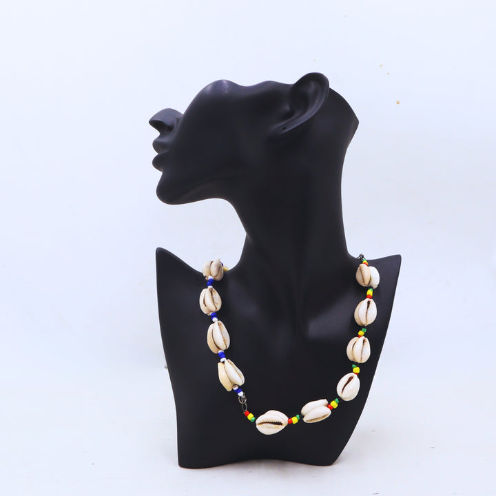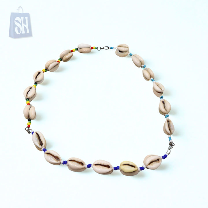 قلادة مصنوعة يدويًا من صدفة الكاوري مع حبات متعددة الألوان.