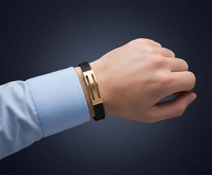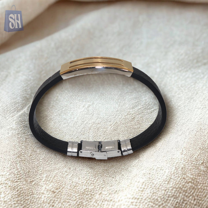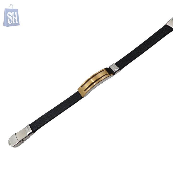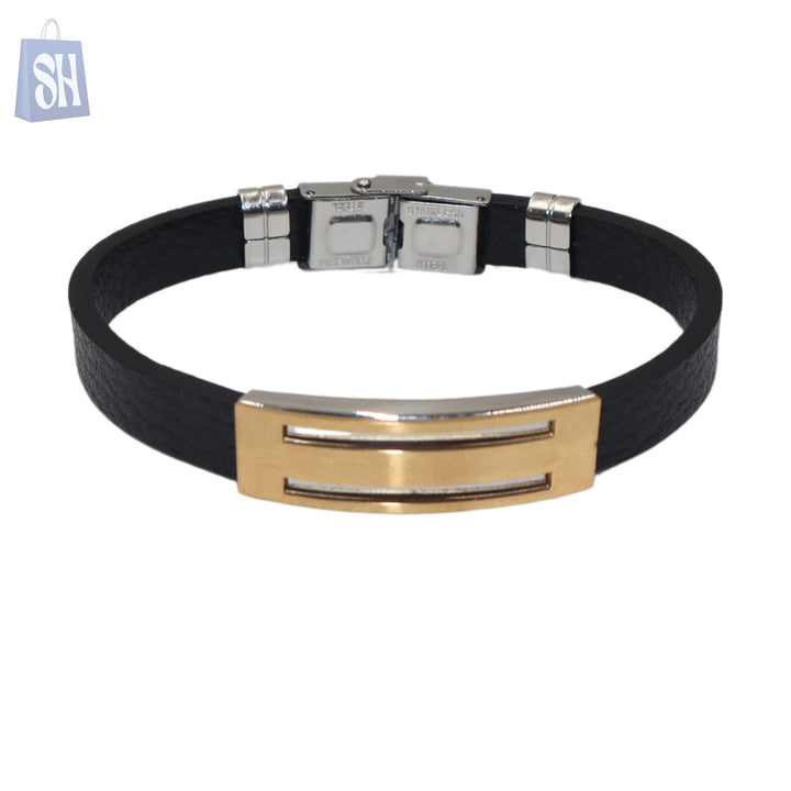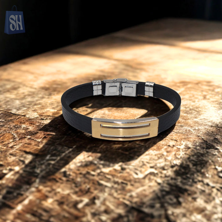 أضف لمسة جريئة إلى مظهرك مع هذا السوار الجلدي الفاخر الذي يتميز بتصميم أنيق من الفولاذ المقاوم للصدأ باللونين الذهبي والفضي .
