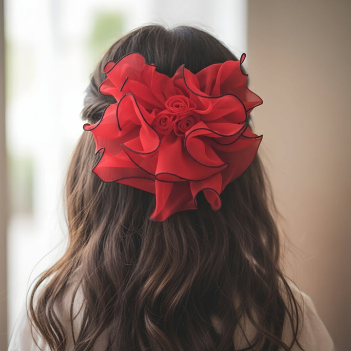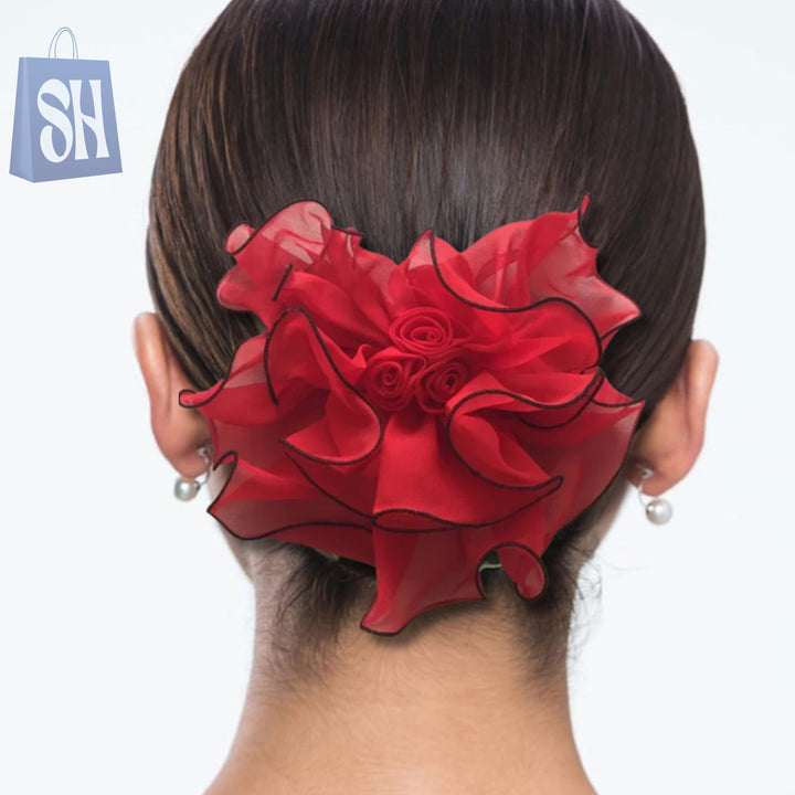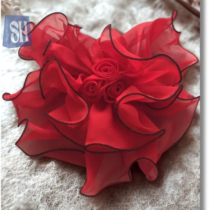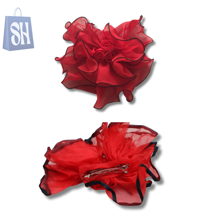 أطلقي العنان لأناقتكِ الداخلية مع مشبك الشعر الرومانسي "الوردة الحمراء" . مصمم ببتلات شيفون ناعمة ومتدلية وورود صغيرة مزخرفة في المنتصف، هذا الإكسسوار الجريء مثالي لخطف الأنظار في أي مناسبة.