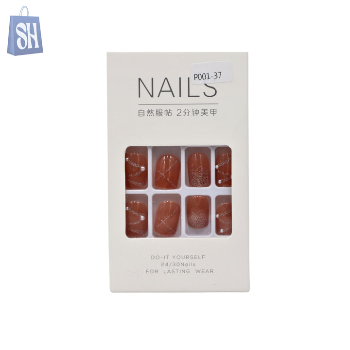 أظافر صناعية حمراء صدئة بتصميم لامع فضي - مجموعة أظافر اصنعها بنفسك