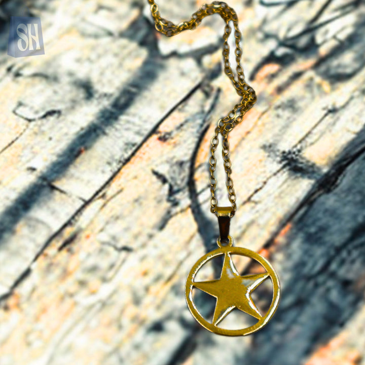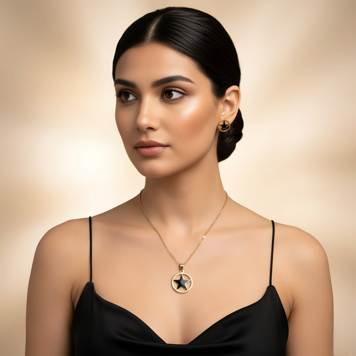 أضفي لمسةً من السحر والجرأة إلى أسلوبكِ مع طقم المجوهرات هذا المصنوع من الفولاذ المقاوم للصدأ ، والمُزين بنقشة نجمةٍ لافتة. يتضمن الطقم قلادةً دائريةً مُدلّاة وأقراطًا مرصّعةً متناسقةً، كلاهما مصنوعٌ بلمسةٍ ذهبيةٍ أنيقة. متينٌ ومقاومٌ للصدأ، ومثاليٌّ للارتداء اليومي أو للمناسبات المميزة. ⭐✨