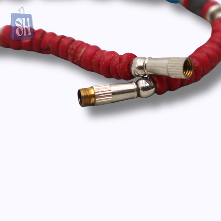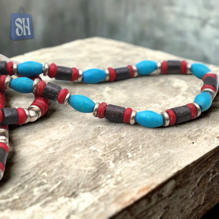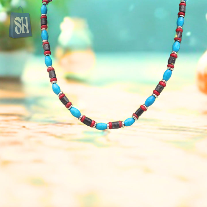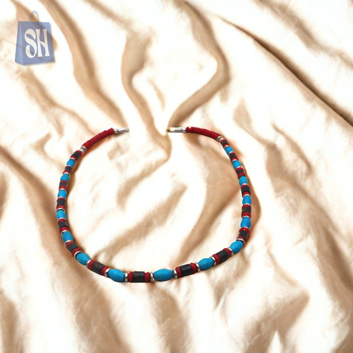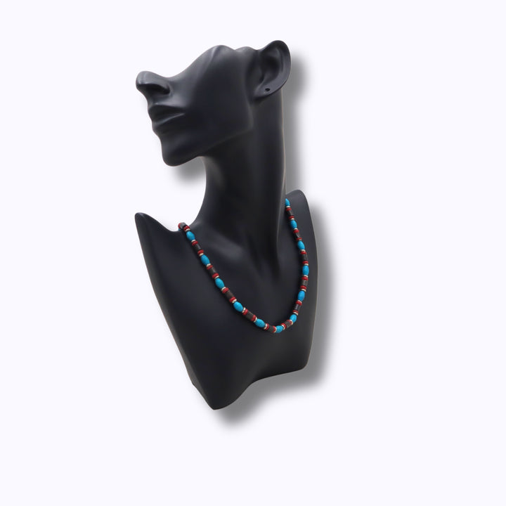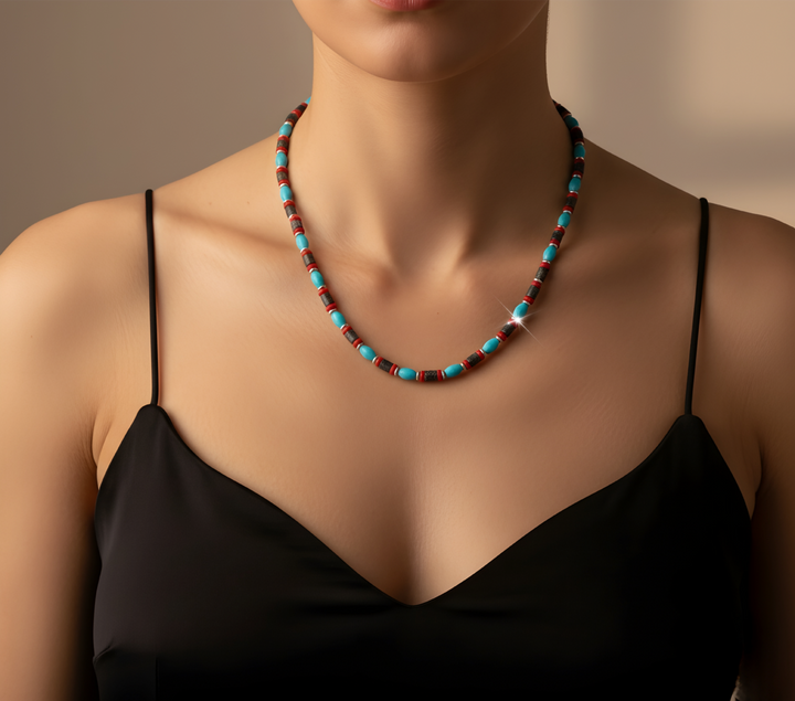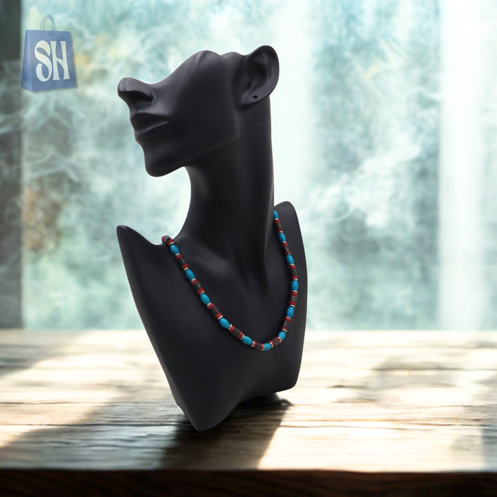 أضفي لمسةً من الأناقة الترابية إلى إطلالتك مع هذه القلادة المصنوعة يدويًا من الخرز. تتميز هذه القطعة بخرزات متناوبة باللون الأزرق الفيروزي والأحمر الماهوجني الداكن، لتضفي لمسةً نابضةً بالحياة وطبيعيةً على أي إطلالة. مثالية للارتداء اليومي والمناسبات الخاصة، وهي مُثبتة على حبل متين لجمال يدوم طويلًا. مثالية كهدية فريدة أو إضافةً خالدة إلى مجموعتك الخاصة.