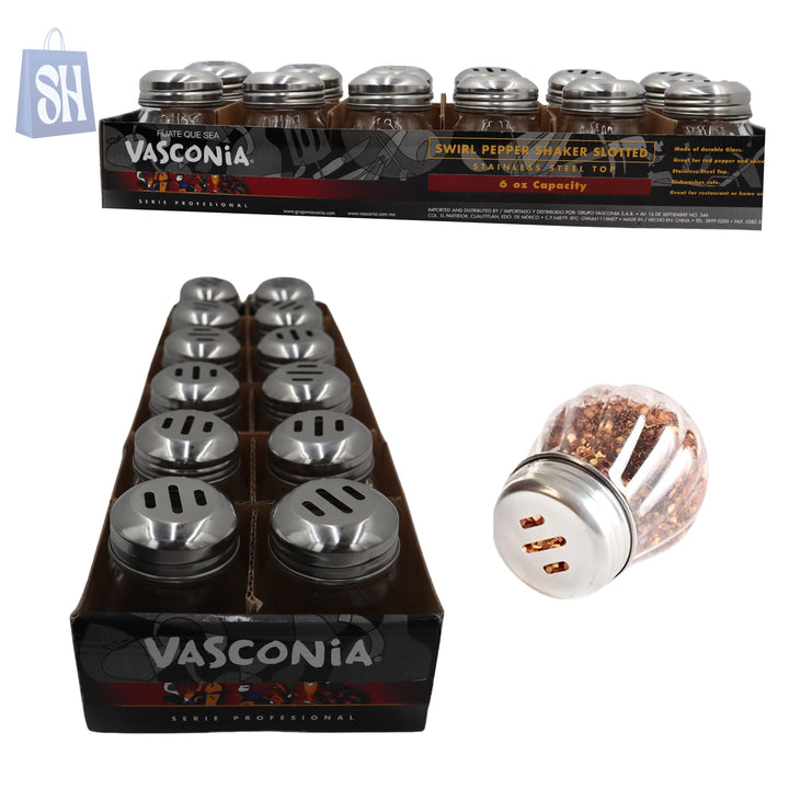 Vintage-style swirl dispensers with lids, ideal for salt and pepper.