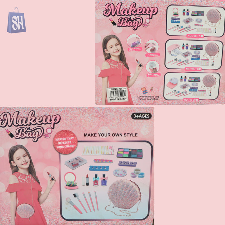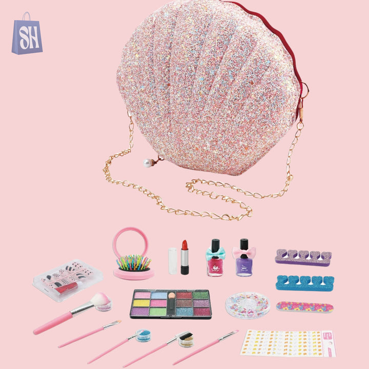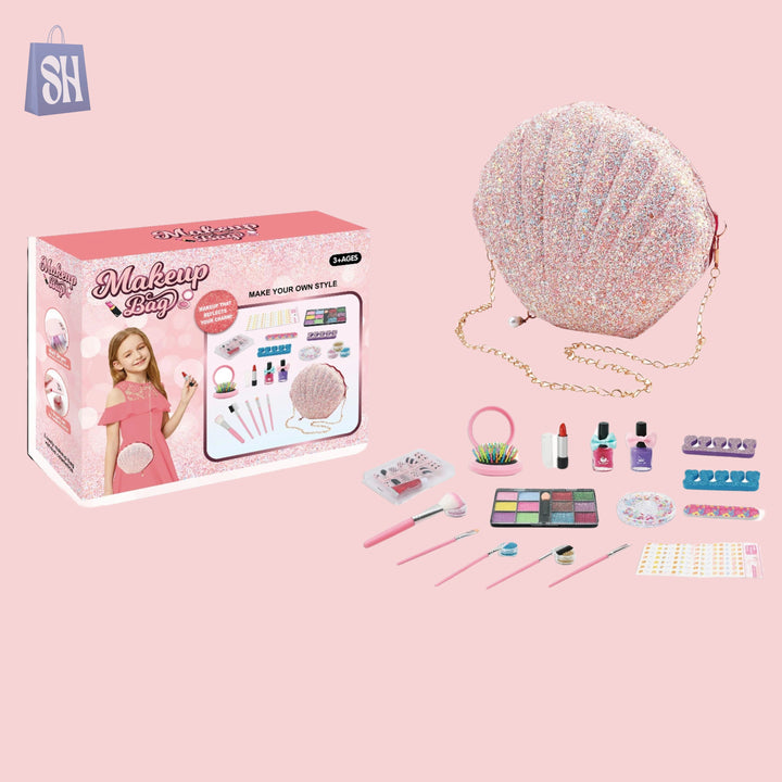 Let your little princess create her own style with this Kids Makeup Bag Set! Designed for safe and fun pretend play, this complete makeup kit for girls includes colorful eyeshadows, nail polish, brushes, lipsticks, and accessories, all packed in a stylish glitter makeup bag. Perfect for role play, parties, or as a gift for girls ages 3+, this set encourages creativity, imagination, and endless fashion fun.