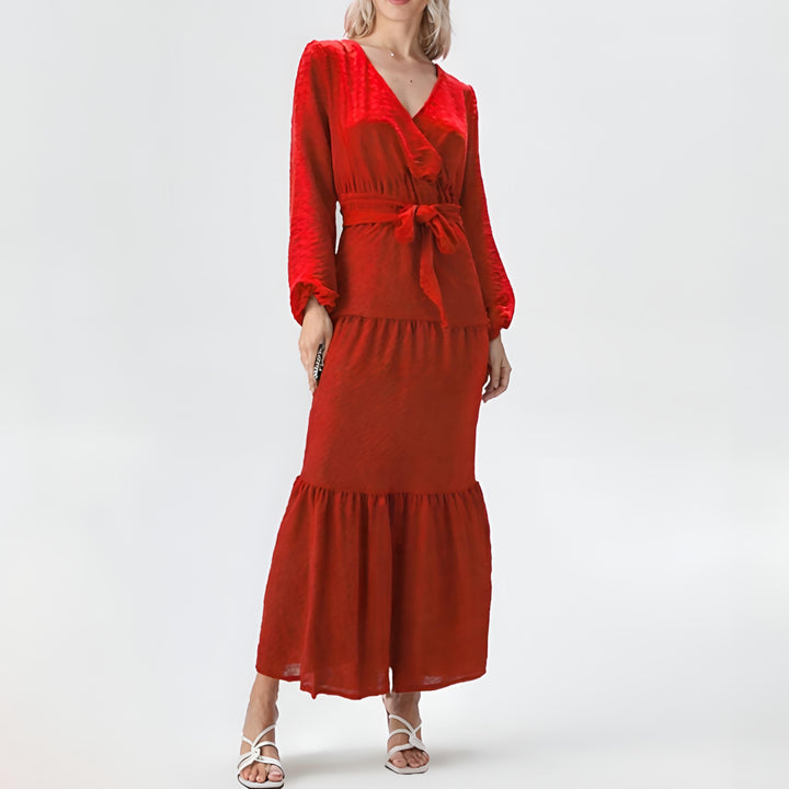 Step out in style with our elegant wrap-style maxi dress, designed to flatter every figure. Featuring a soft dotted texture, a V-neckline, and a tie-waist belt for a cinched silhouette, this dress brings both comfort and class. Perfect for casual days, special occasions, or modest fashion lovers.