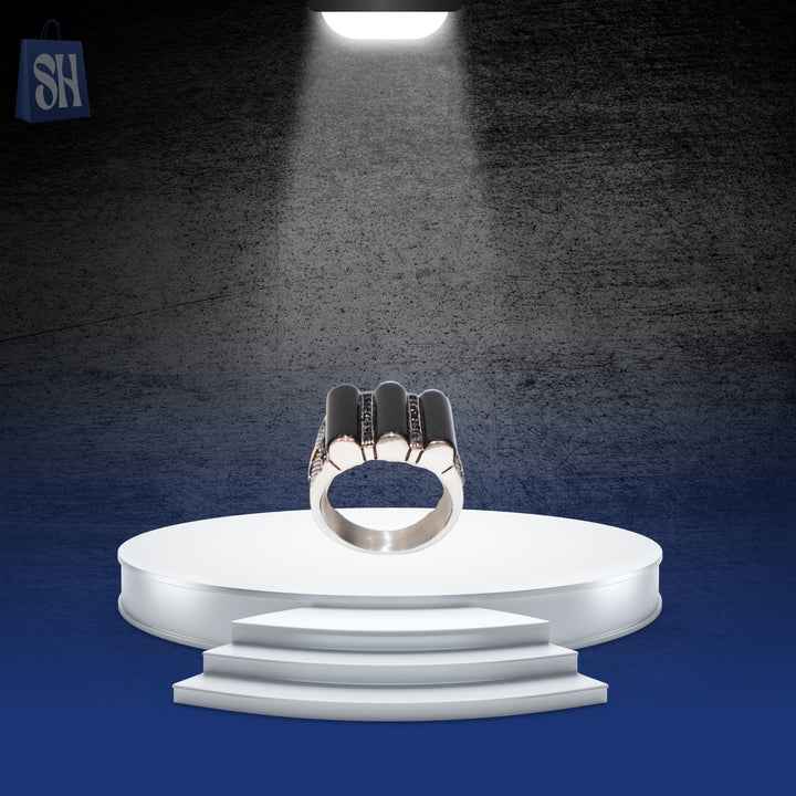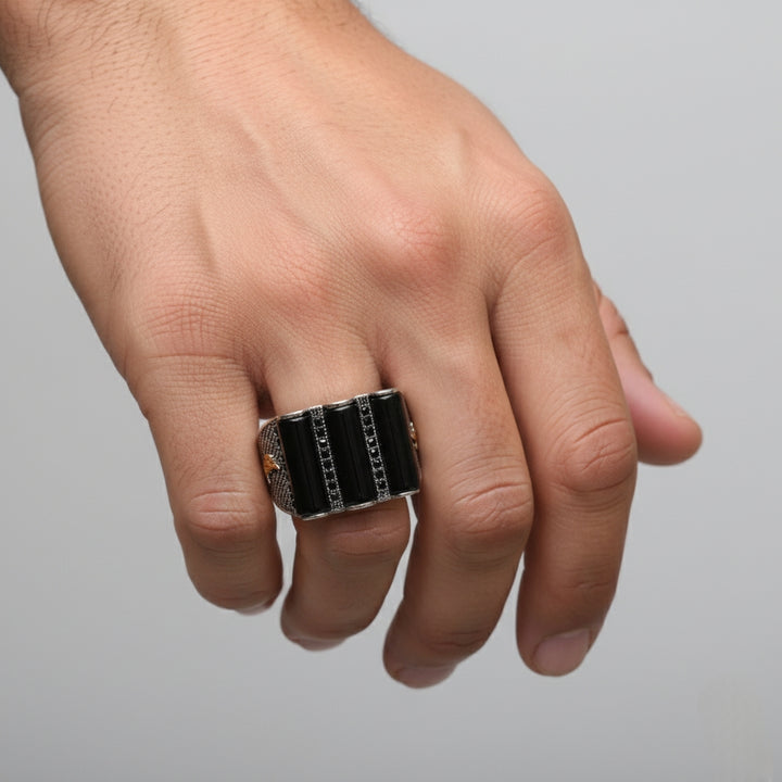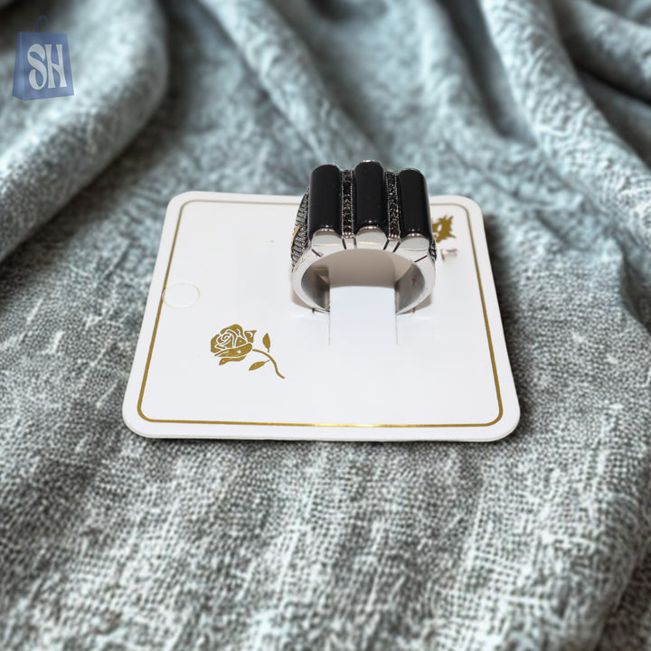 "Bold elegance meets modern flair – this statement ring is designed to turn heads. Featuring sleek black accents and shimmering details, it’s the perfect piece to elevate any outfit. Whether you're dressing up or keeping it casual, this ring adds just the right touch of sophistication and edge."
