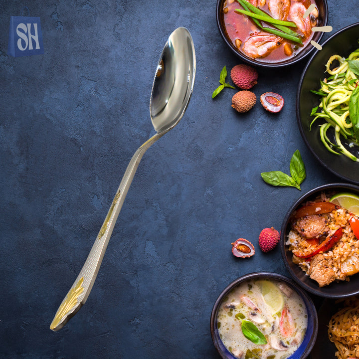 Elevate your table setting with the Regalia™ Gold-Accent Stainless Steel Spoon Set, a pack of six exquisitely crafted spoons that blend timeless elegance with daily functionality: