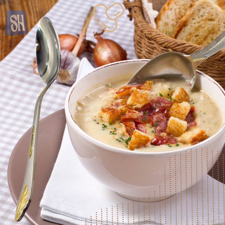 Elevate your table setting with the Regalia™ Gold-Accent Stainless Steel Spoon Set, a pack of six exquisitely crafted spoons that blend timeless elegance with daily functionality: Premium German-Crafted Stainless Steel: Durable...