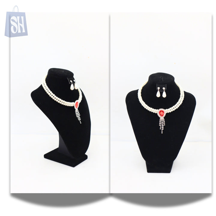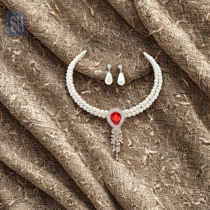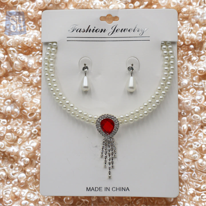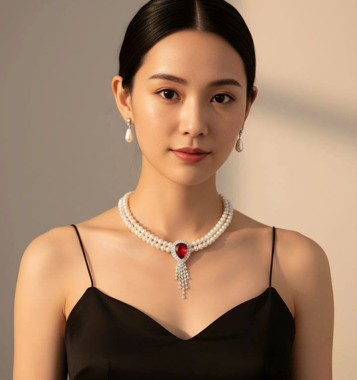 Vintage-Inspired Pearl Necklace & Drop Earring Set with Red Gem Centerpiece