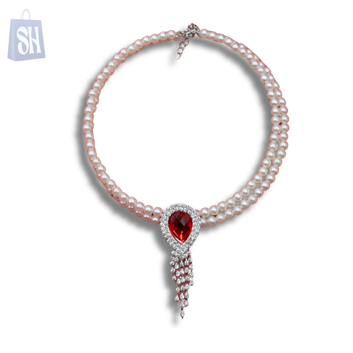 Make a bold statement with this exquisite vintage-inspired jewelry set, featuring a double strand of lustrous faux pearls and a striking teardrop-shaped red gem centerpiece. The pendant is elegantly framed with...