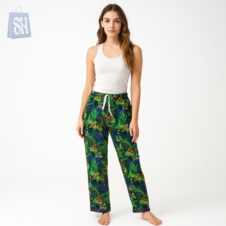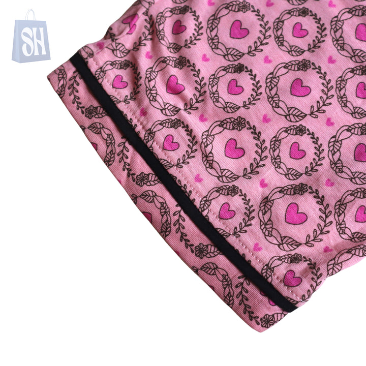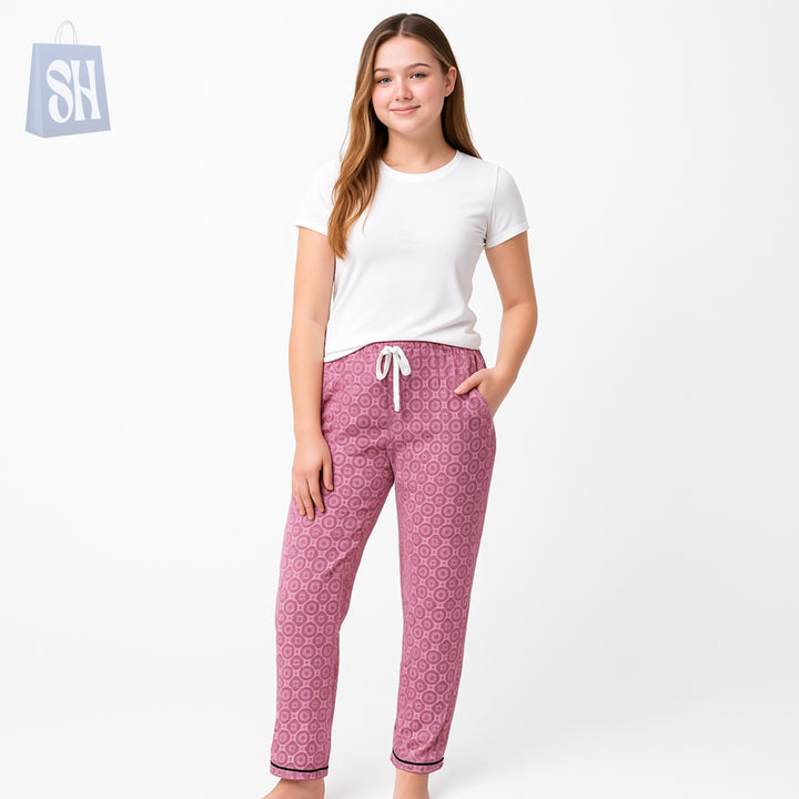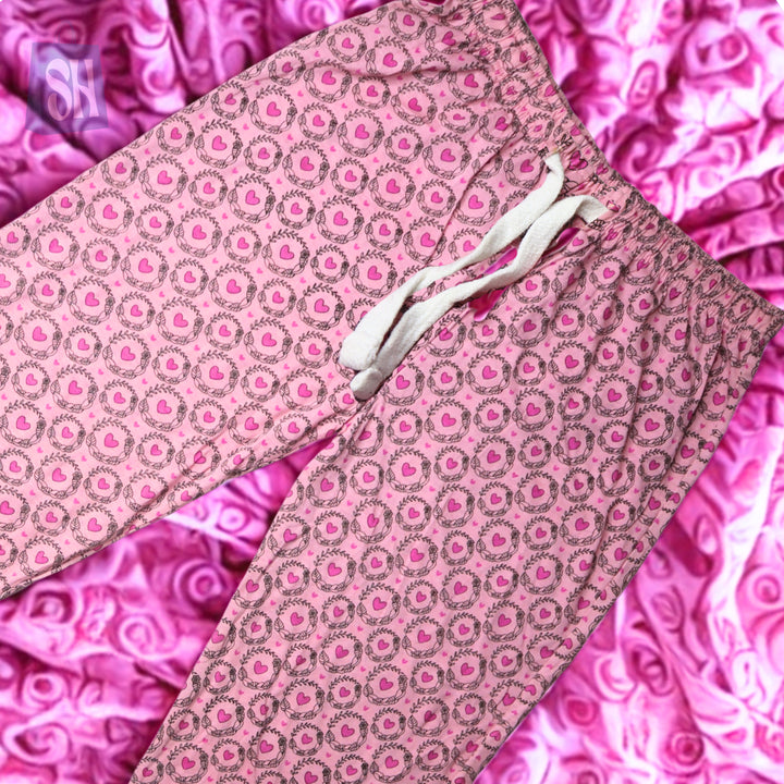 "Add a touch of sweetness to your loungewear with these pink pajama pants featuring a lovely heart print design. Made with soft, breathable fabric and an adjustable drawstring waistband, they provide maximum comfort for relaxing at home or a cozy night’s sleep. Perfect for those who love cute and comfy sleepwear."